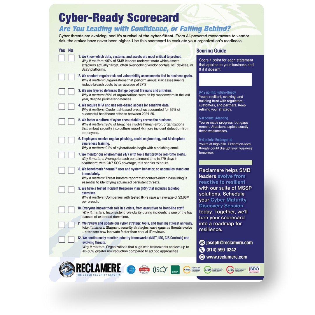 The threat landscape is evolving faster than most SMBs can adapt. From AI-powered ransomware to insider risk, today’s attacks test not only your technology but your strategy, culture, and leadership. Use our Cyber-Ready Scorecard to find out how prepared your business truly is.